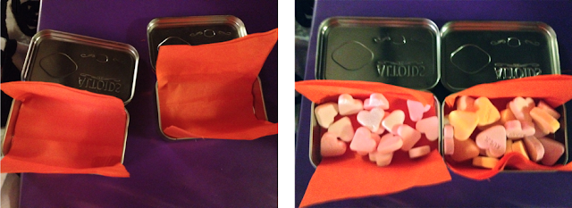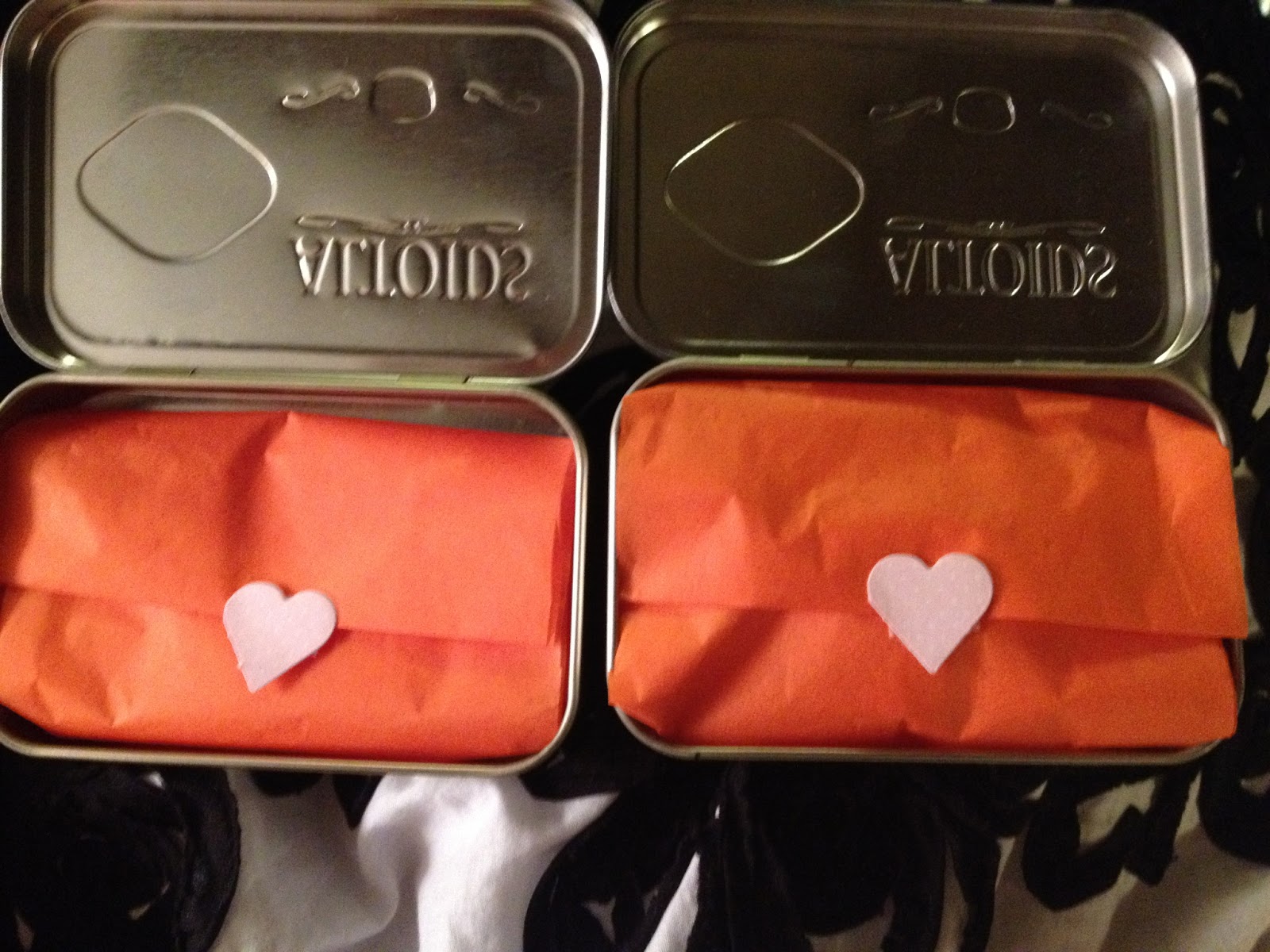 This was a passing idea I had when I saw two old Altoid tins lying around. I used them to divide the mint and fruity hearts. Here’s what I did:
