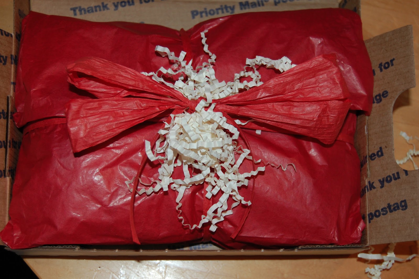 …All packed in with tissue paper and raffia ribbon. I decorated the outside of the box with a paper doily and a bow that I laquered down using Modge Podge.