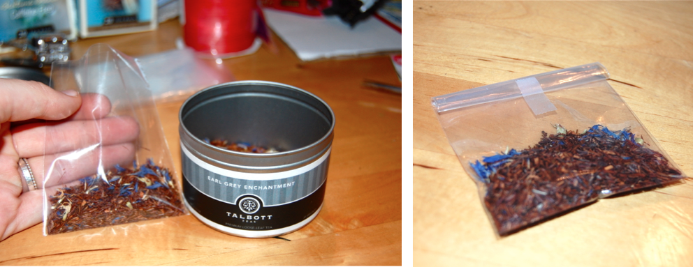 - A robot tea strainer and five self-labeled bags of loose leaf tea (bottom left; strainer is in the orange packaging)