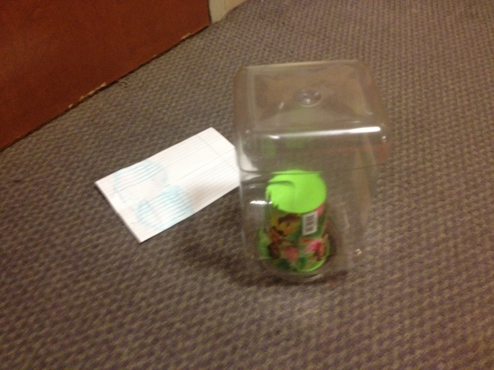 We ended up covering the entire package in leftover Chinese homework so that we wouldn’t have to look at the bug if it moved around the container while we took it outside.